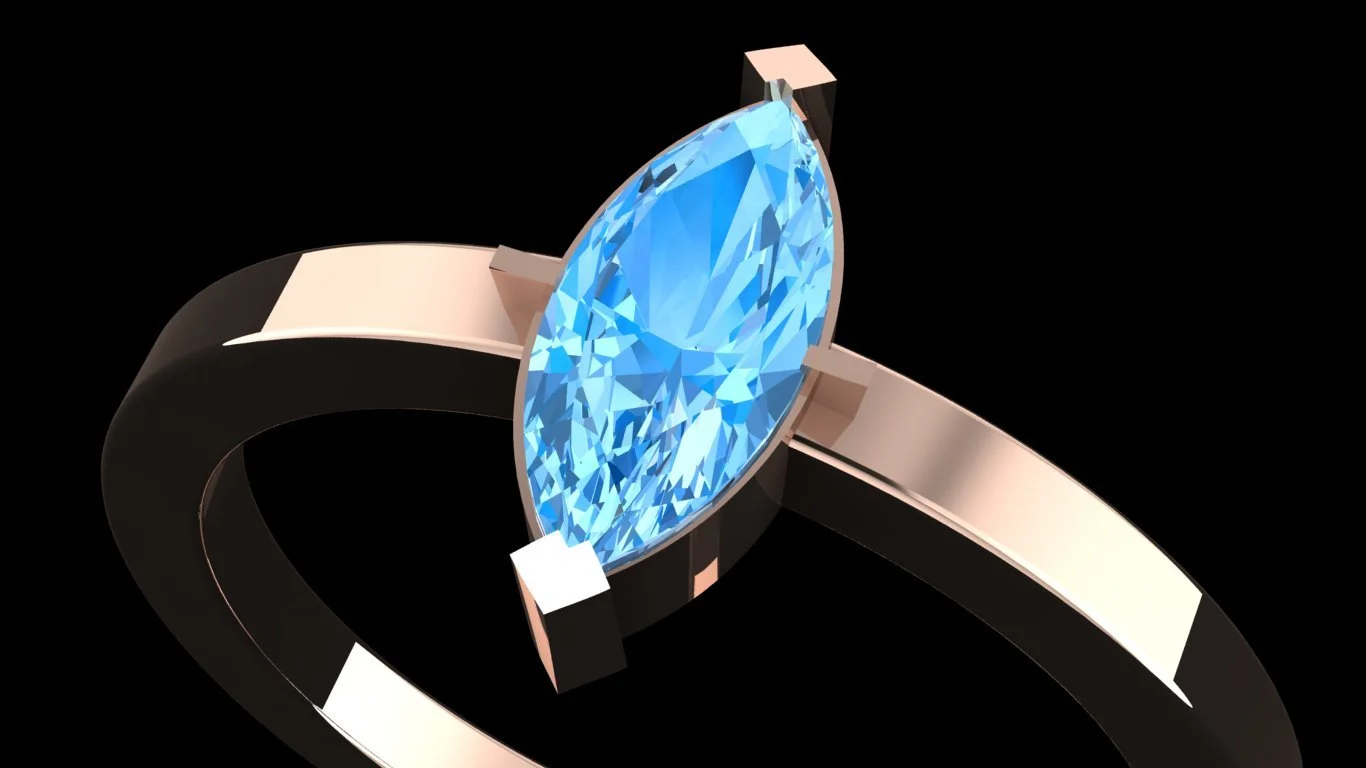 Indicatieve prijs: 1 x 14K rosegouden ring met een Fancy Intense Blue Marquise LAB-diamant van 0.51 karaat, met een VS1-helderheidsgraad en afmetingen van 9.00 x 3.99 x 2.50 mm = 1800 euro.